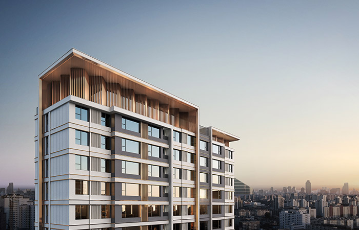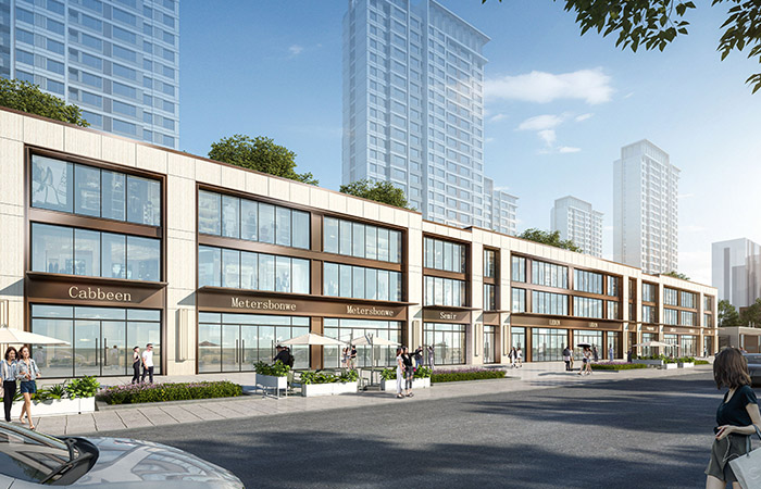 住宅立面采用簡潔的水平線條與挺拔豎向線條形成對比,打造經(jīng)典、簡約的立面風格。在近人尺度部位、檐口、頂部造型等,采用金屬鋁板、金屬線條等高品質(zhì)材料打造。建筑色彩分區(qū)規(guī)劃,結(jié)合低彩度、高明度的米白、淺灰、淺咖等色彩,整體形成豐富有序的城市界面。
