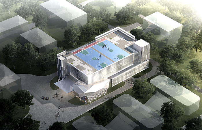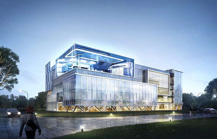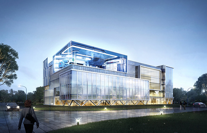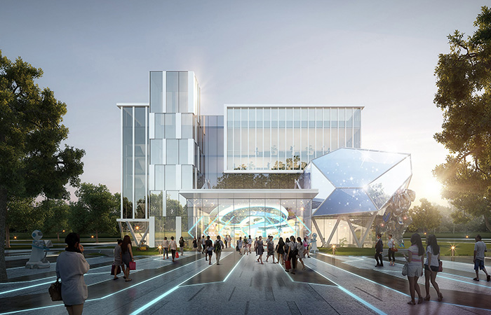 項目以科技“模方”,動感“魔石”,智能“膜屏”為設(shè)計理念, 采用模塊設(shè)計手法,將模方單元的組合形成虛實結(jié)合的建筑形態(tài),模方單元內(nèi)白色龍骨陣列排序,打造時代科技框感;采用不規(guī)則形體設(shè)計手法,融入能量石的設(shè)計元素,設(shè)計中機器人背抗能量石,增加機器人與建筑的互動,打造機器人智能基地門戶標致;采用3D裸眼屏等高科技技術(shù)賦予建筑表皮,將科技與智能產(chǎn)品于室內(nèi)室外進行多方位展示,打造出獨一無二的人工智能IP級視訊窗口。三種手法的運用,共創(chuàng)邯山門戶人工智能基地。