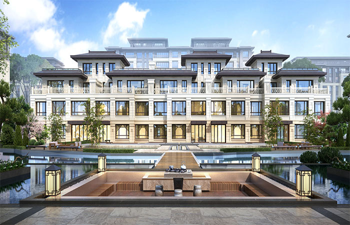 建筑立面整體風格以中式為主,為了濃縮中式傳統(tǒng)建筑精髓,彰顯地域特征,采用了中國古代建筑的形制、構(gòu)筑與符號,通過選材和構(gòu)造設計,彰顯中式建筑的美麗。建筑采用白色、駝色與淺灰作為整體主色調(diào),結(jié)合中式元素,整體效果恢弘大氣。