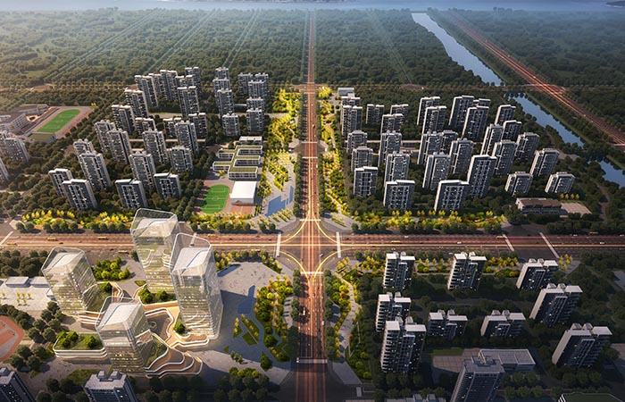 多地塊聯(lián)合規(guī)劃 城市級居住區(qū) 沿秦嶺北街、天桂北街、太行北大街三條南北向城市主路形成長約1000米,以秦嶺北街為主要道路寬約150米的縱向生態(tài)文化軸線,依托片區(qū)濱水綠地形成了三個中心,形成豐富的文化性架構(gòu)。