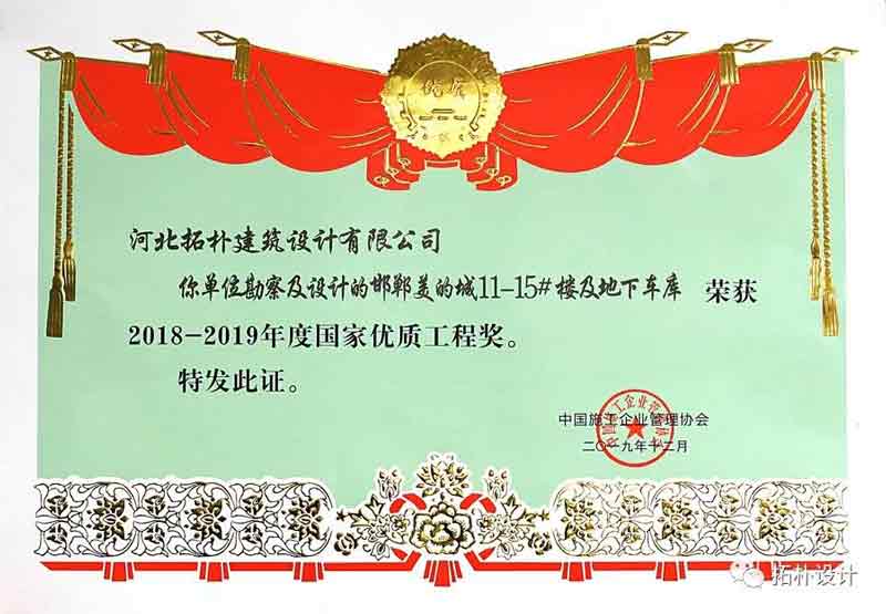 國家優(yōu)質(zhì)工程獎設(shè)立于1981年,是經(jīng)國務(wù)院確認(rèn)的我國工程建設(shè)領(lǐng)域設(shè)立最早,規(guī)格最高,跨行業(yè)、跨專業(yè)的國家級榮譽(yù)獎勵。拓樸設(shè)計榮獲“國家優(yōu)質(zhì)工程獎”獎項,倍感驕傲和自豪。此前,邯鄲美的城項目也曾榮獲河北省優(yōu)秀工程勘察設(shè)計獎和中國土木工程詹天佑優(yōu)秀住宅小區(qū)獎。拓樸設(shè)計初心依舊,砥礪前行!