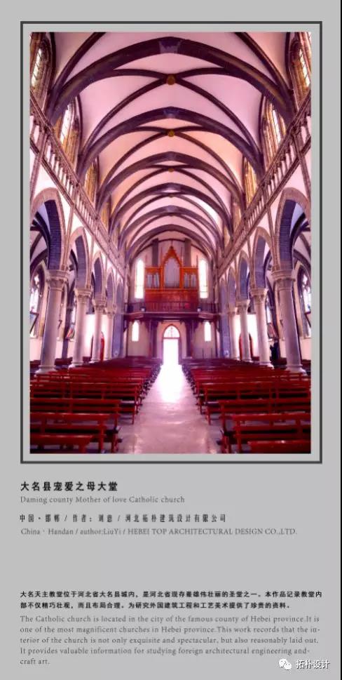 大名天主教堂位于河北省大名縣城內(nèi),是河北省現(xiàn)存最雄偉壯麗的圣堂之一。本作品記錄教堂內(nèi)部不僅精巧壯觀,而且布局合理。為研究外國(guó)建筑工程和工藝美術(shù)提供了珍貴的資料。